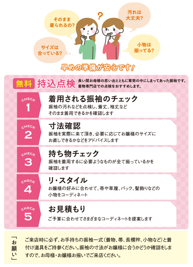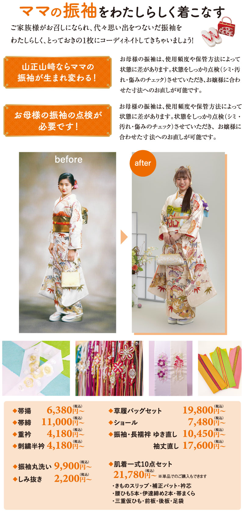 振袖のお手入れ・寸法直し等は専門店の山正山﨑にお任せください。