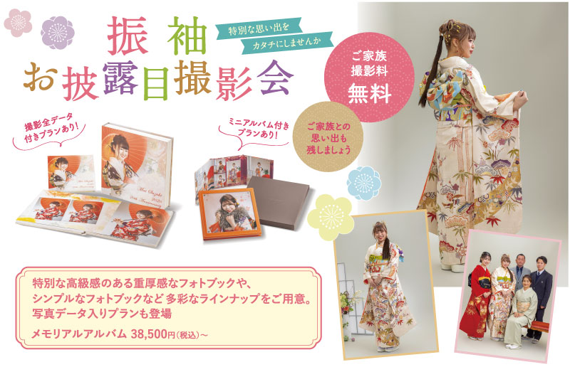プロの美容師によるヘアメイク、経験豊富なプロの着付師により綺麗に仕上げられた美しい振袖姿のあなたを、プロのカメラマンが一瞬一瞬写真に残します。このお披露目撮影会はご家族でお祝いする大切な時間。楽しく和やかな雰囲気の中で、かけがえのないひとときをご家族で過ごしませんか。