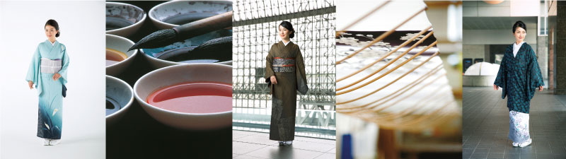 <室華風>の着物は、刻々と姿を変える“自然の美”をテーマに、専門の染織工房で染められています。その特徴は、光の陰影から生まれる色彩を使い、複数の技法を効果的に組み合わせて、無線友禅ならではの深みある表情を立体的に創っていきます。アート感覚にアレンジされた柄や構図は、<風景><新琳派><花柄><抽象><新古典>と実に多彩で、幅広い年齢層に対応できます。