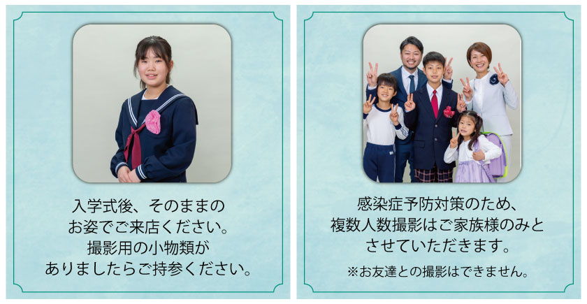 なお、感染症予防の観点から、複数人数での撮影はご家族様のみとさせていただきます。お友達との撮影はできませんので、ご理解、ご了承のほど、よろしくお願いいたします。