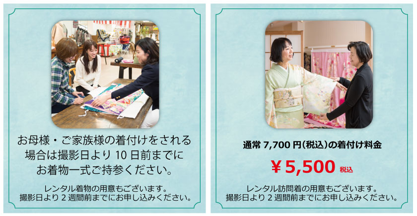 中学校入学式は、ご本人だけでなく、ご家族にとっても特別な喜びの行事。入学式には、お母様もお着物で参列しませんか? 山正山﨑がお手伝いいたします。入学式当日の着付けは特別価格¥5,500(税込)で承ります。着付けをご希望の場合は、着付けのお時間をご予約いただいたうえで、3/31(火)までに着物他一式を山正山﨑までお持ちください。また着物レンタルも扱っております。レンタルご希望の場合は3/24(火)までに山正山﨑までお越しください。