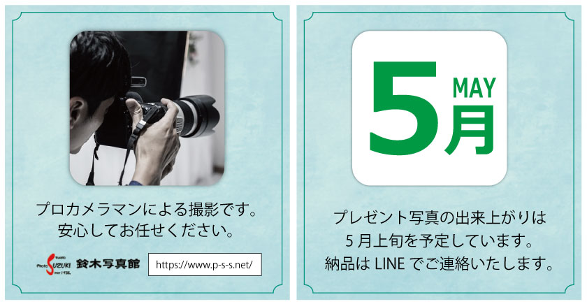 入学式当日の撮影は、プロカメラマンが行います。プロ品質のお写真をプレゼントとしてご用意いたしますので、ご期待ください。出来上がりは5月頃を予定しております。出来上がりの連絡はLINEでお伝えいたします。その際には、追加のお写真や画像データのご注文も承ります。
