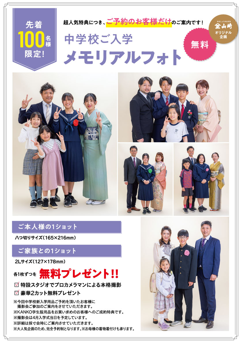 毎年大人気の中学校ご入学メモリアルフォト撮影会の予約が、いよいよ3/10(火)12時よりスタートいたします。撮影会は山正山﨑で中学校ご入学用品をお買い物いただいたお客様先着100名様限定の企画です。皆さまのご予約をお待ちしております!